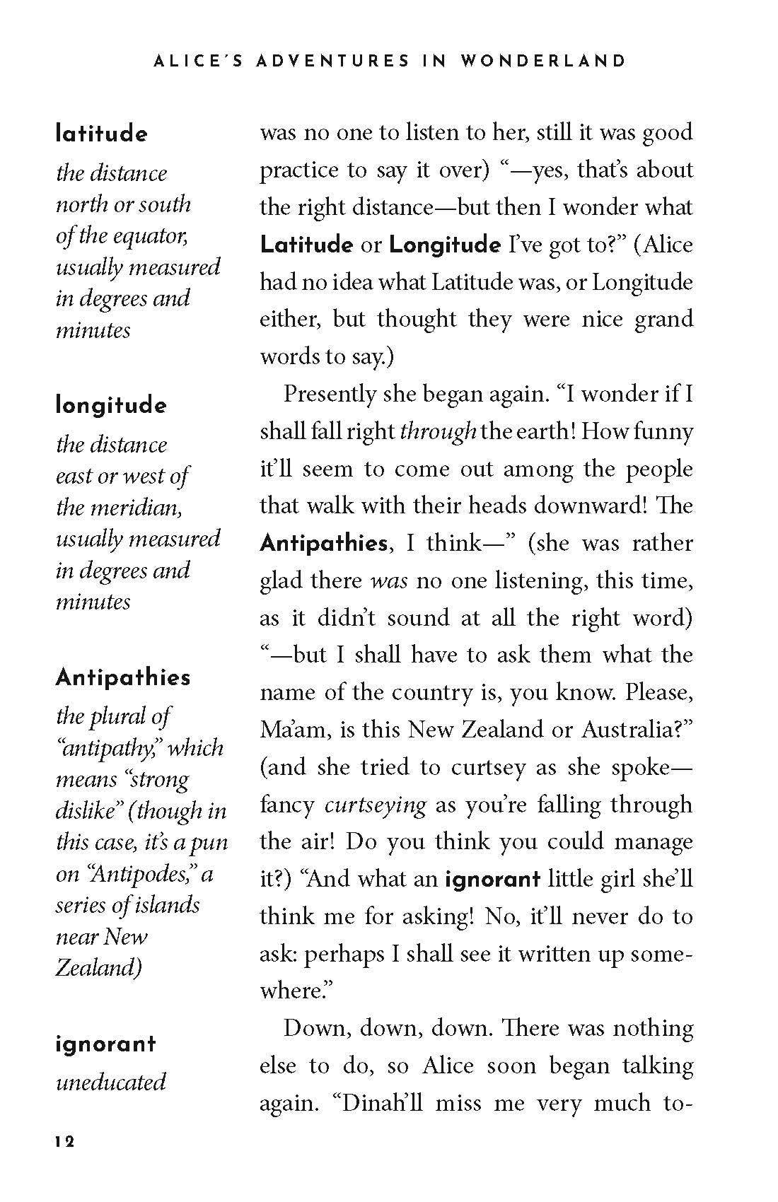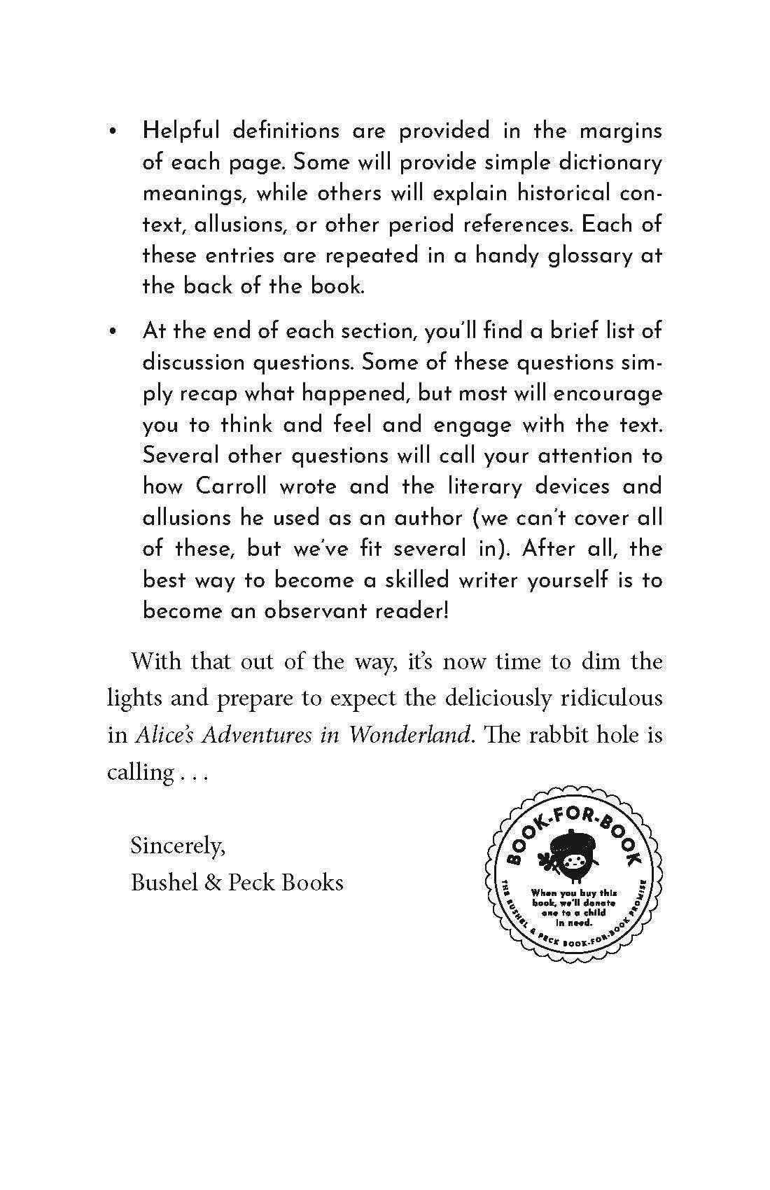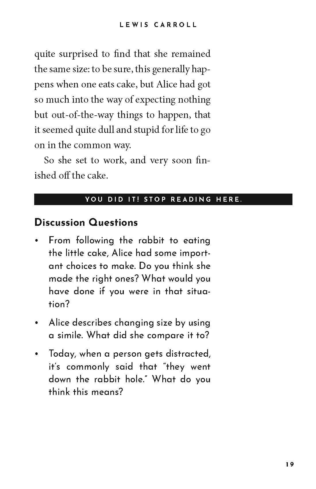 In Alice's Adventures in Wonderland: The Read-With-Me Edition, the unabridged text of the beloved story of the white rabbit, the mad tea party, and the stolen tarts is broken down into easy, twenty-minute blocks—perfect for daily read-alouds. Thoughtful questions after each passage boost comprehension and facilitate meaningful discussion, while definitions in the margins make it easy for parents to explain what challenging words might mean. Learn vocabulary, strengthen literacy, introduce the classics, and bond over beautiful literature in just 20 minutes a day!