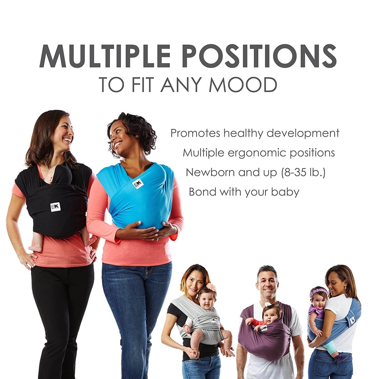 - Carry newborns and infants from 8 to 35lbs (consult pediatrician for babywearing under 8lbs)