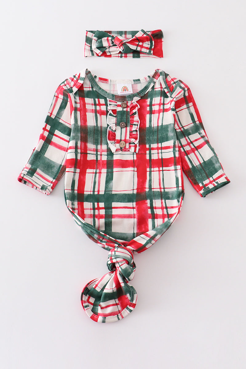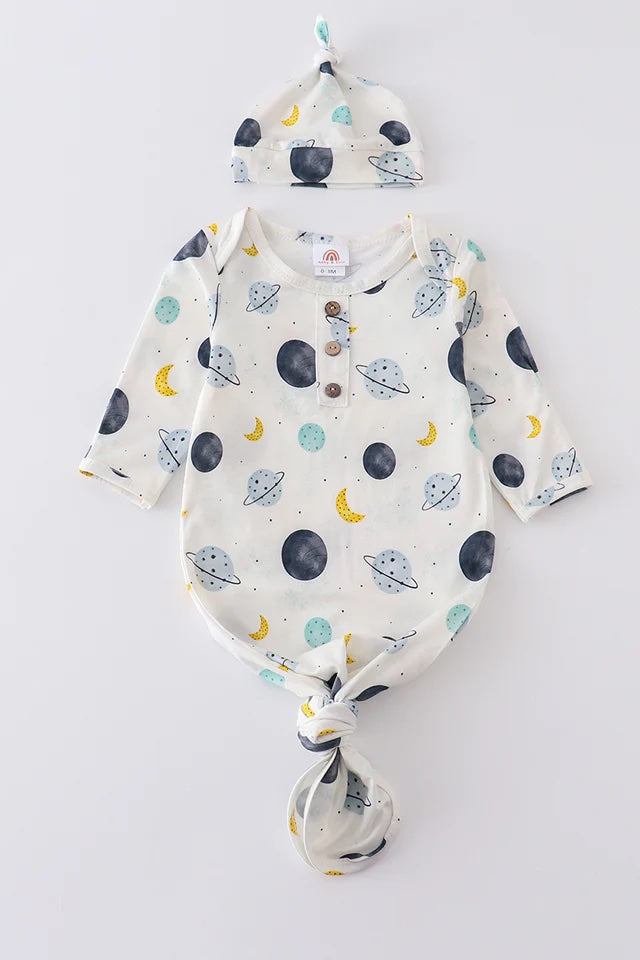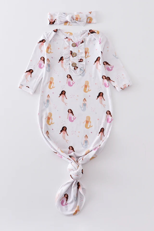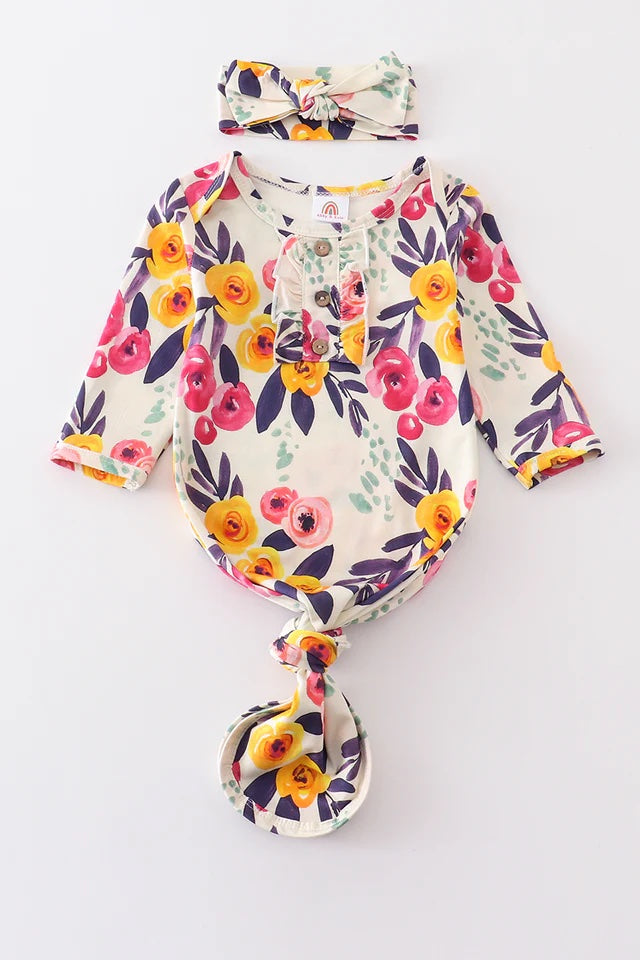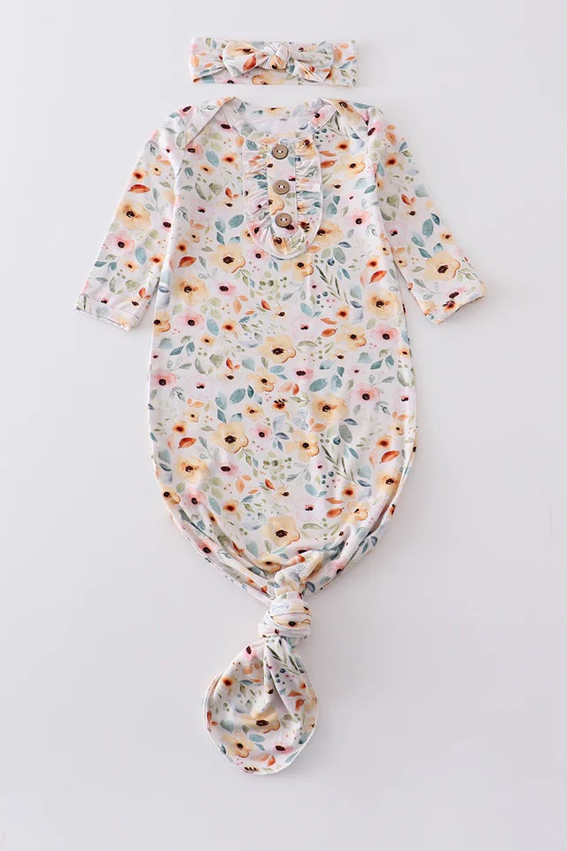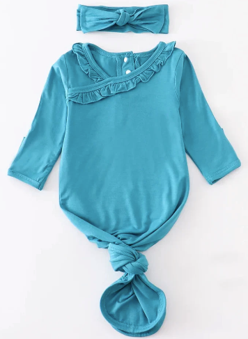 By popular demand, we now have infant gowns! Choose your favorite pattern- each comes with either a coordinating headband or hat. Your little one will be so cozy snuggled up in these gowns, and you'll love the fold over sleeves to prevent scratches and versatile open bottom that can be tied and untied easily for diaper changes! The bamboo fabric is super stretchy, so while recommended for birth through 3 months, we think you'll find that these will work much longer as baby grows!