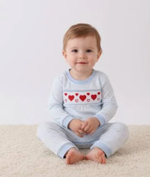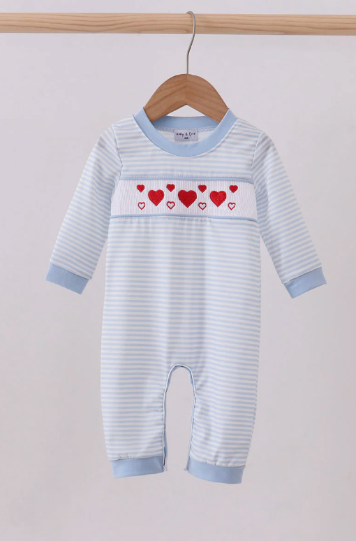 Adorable blue romper featuring charming heart smocking and classic stripes for effortless style.