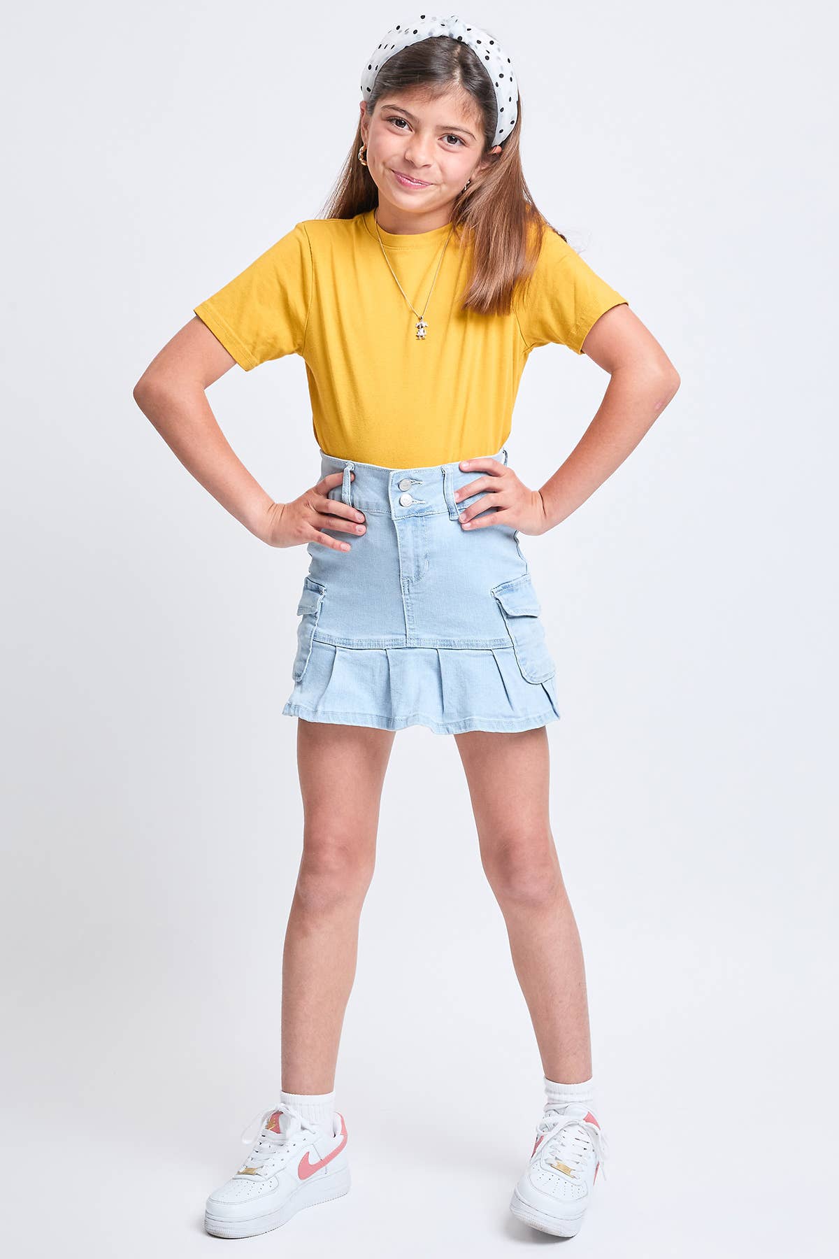 Girls Cargo Pleated Denim Mini Skirt by YMI - a chic and versatile addition to any young fashionista's wardrobe! This mini skirt features stylish pleats that add a touch of sophistication to its design. The 1-button closure with zipper ensures easy wear, while the snap cargo pockets provide both style and functionality. Perfect for pairing with your favorite tops and sneakers, this skirt is ideal for both casual outings and special occasions. Elevate your look with the Girls Cargo Pleated Denim Mini Skirt by YMI and let your unique style shine!