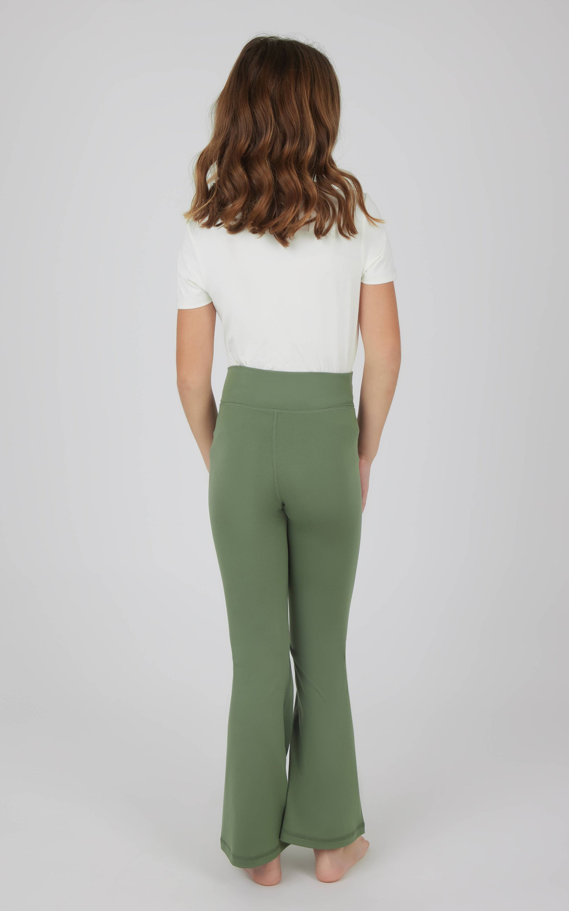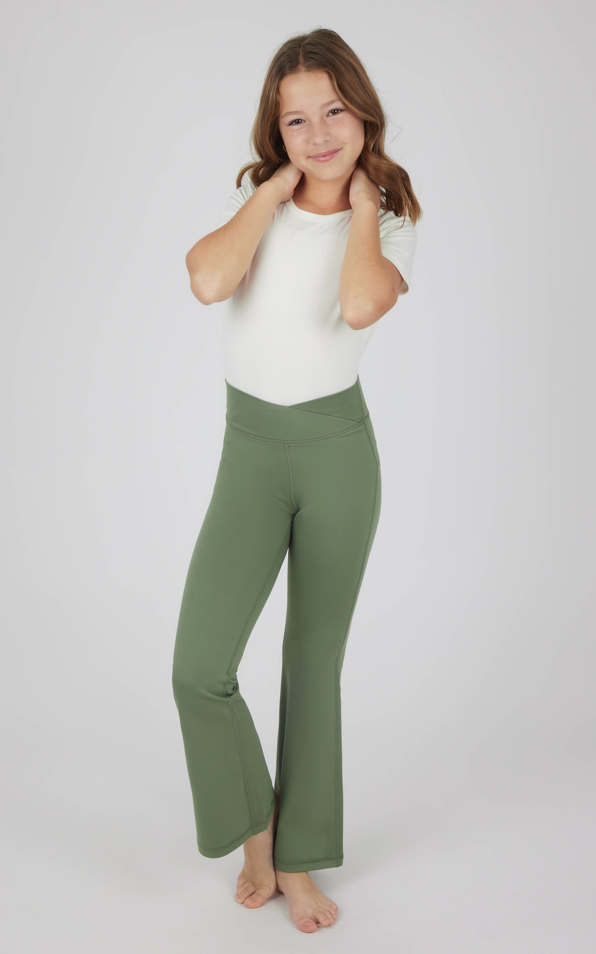 Girls Interlock Crossover Full Length Flare Leg Pants - Easy to style, good for everyday outfits - Elastic Free Waistband - Machine Wash Cold - Lay flat to dry, no heat