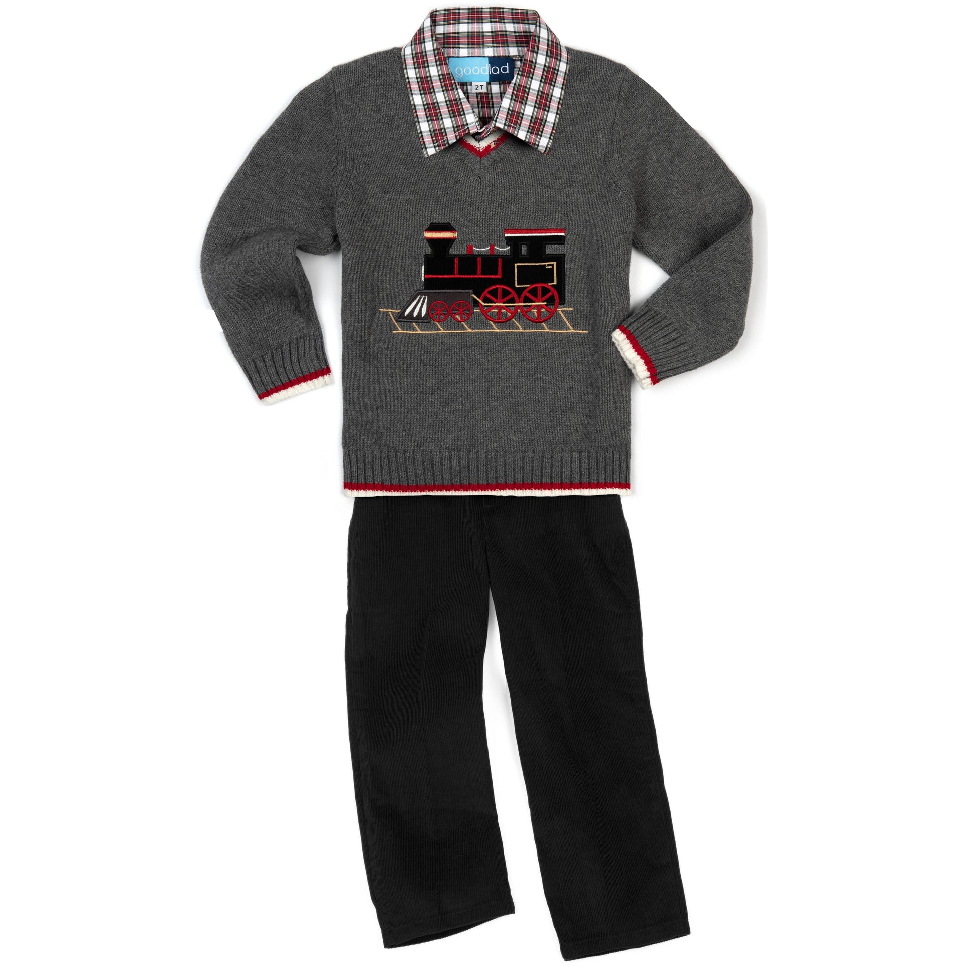 Perfect for the holidays, this three-piece sweater set. Long sleeve V-neck grey sweater with train applique, black corduroy pants, plaid woven button-down shirt.