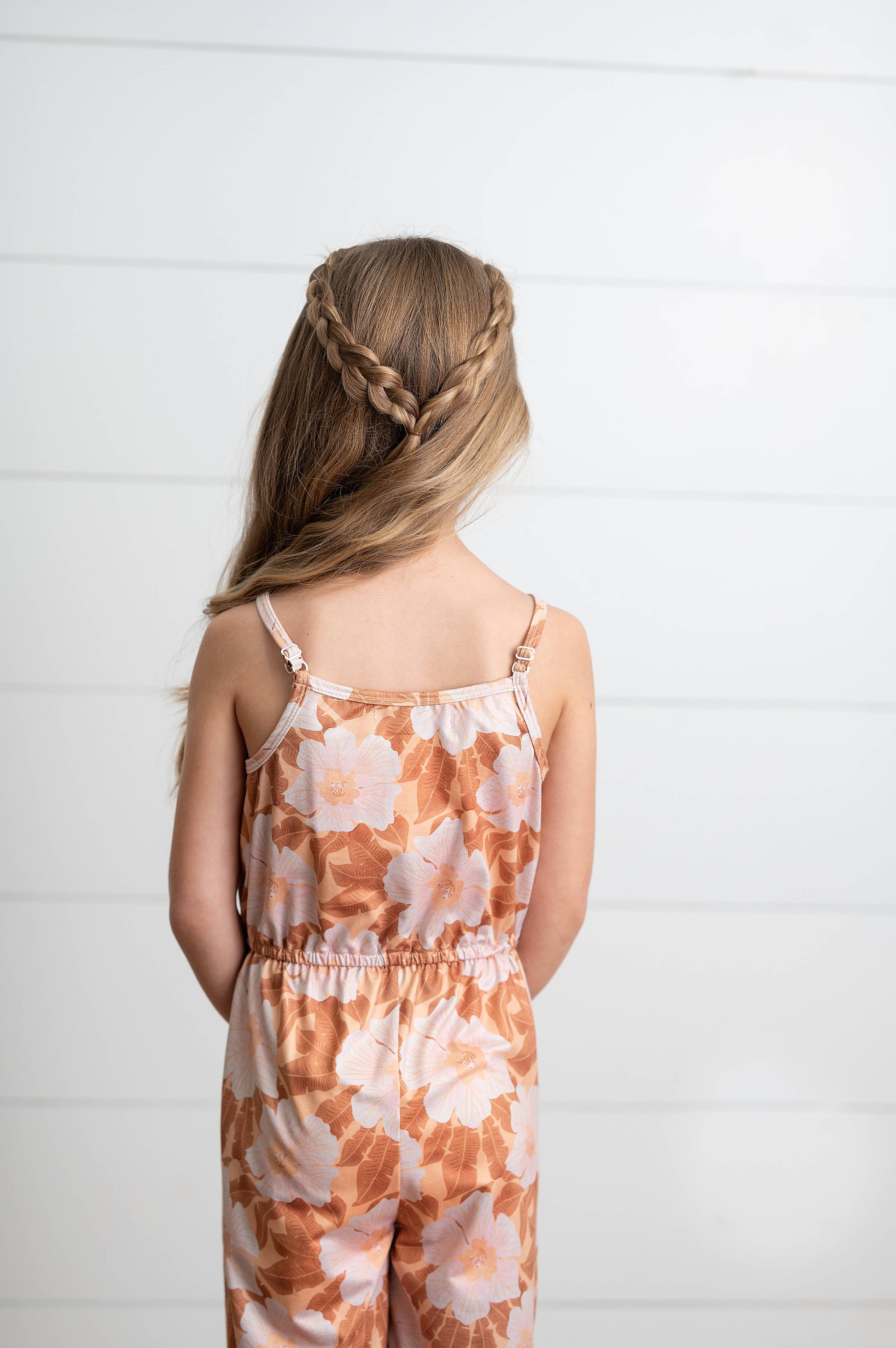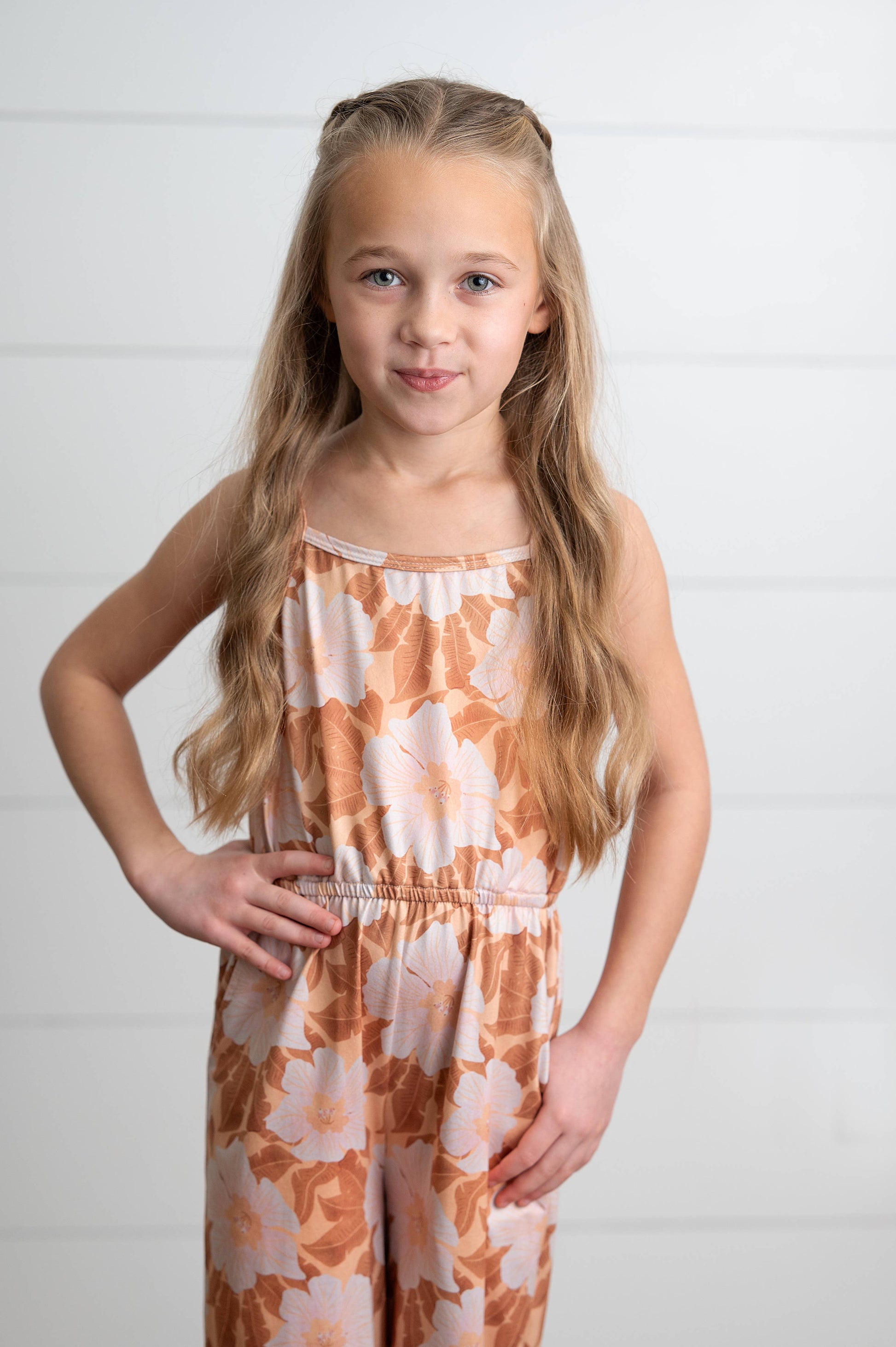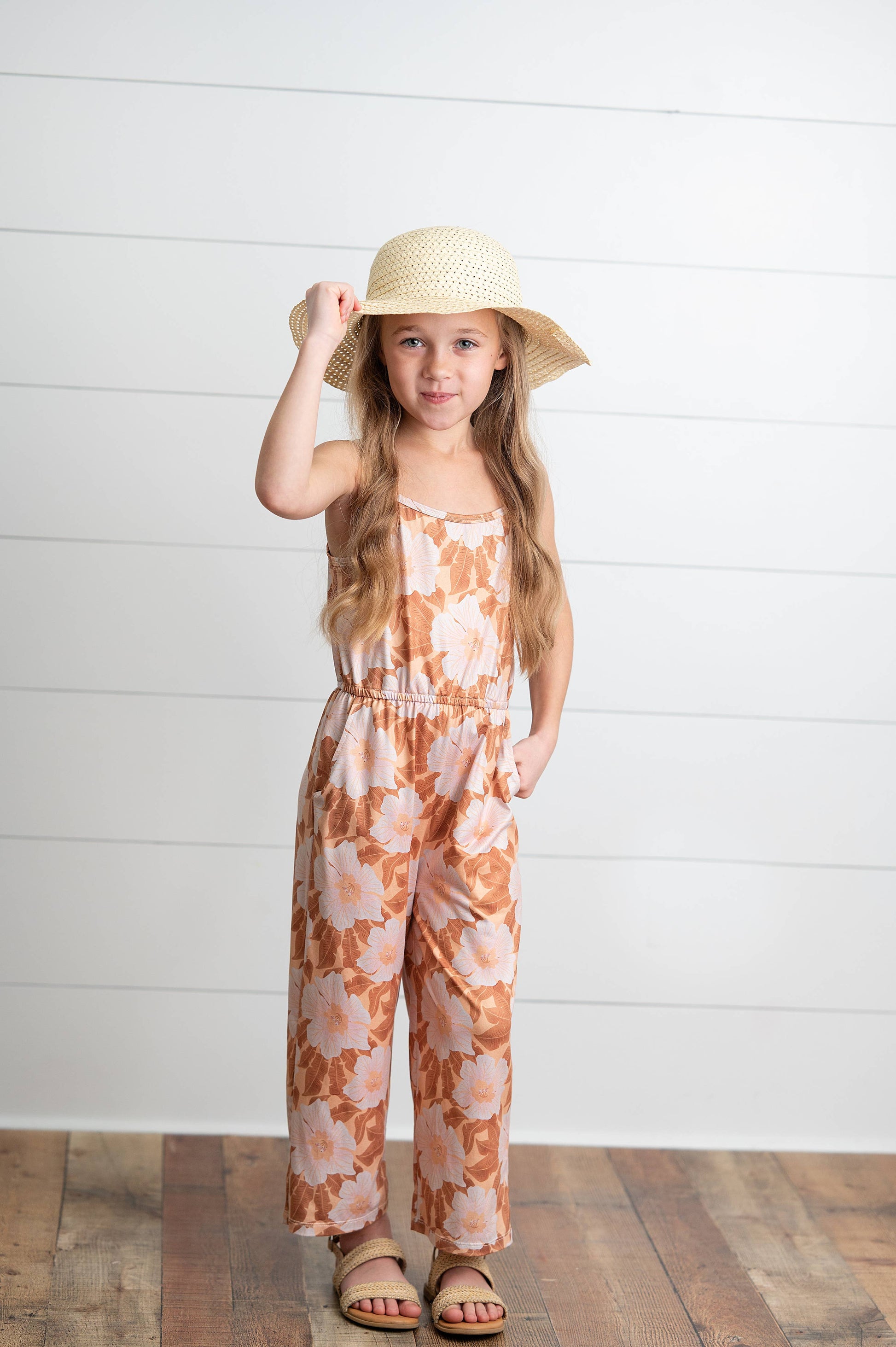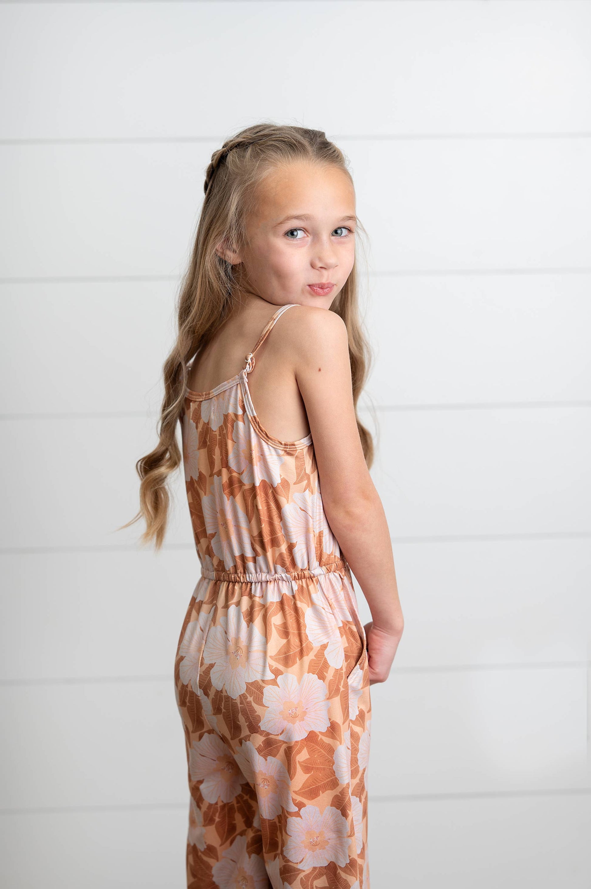 Girls golden floral and peach flower print jumpsuit with adjustable spaghetti straps and pockets. Pair with a denim jacket for the perfect back to school look! 92% Polyester, 8% Spandex