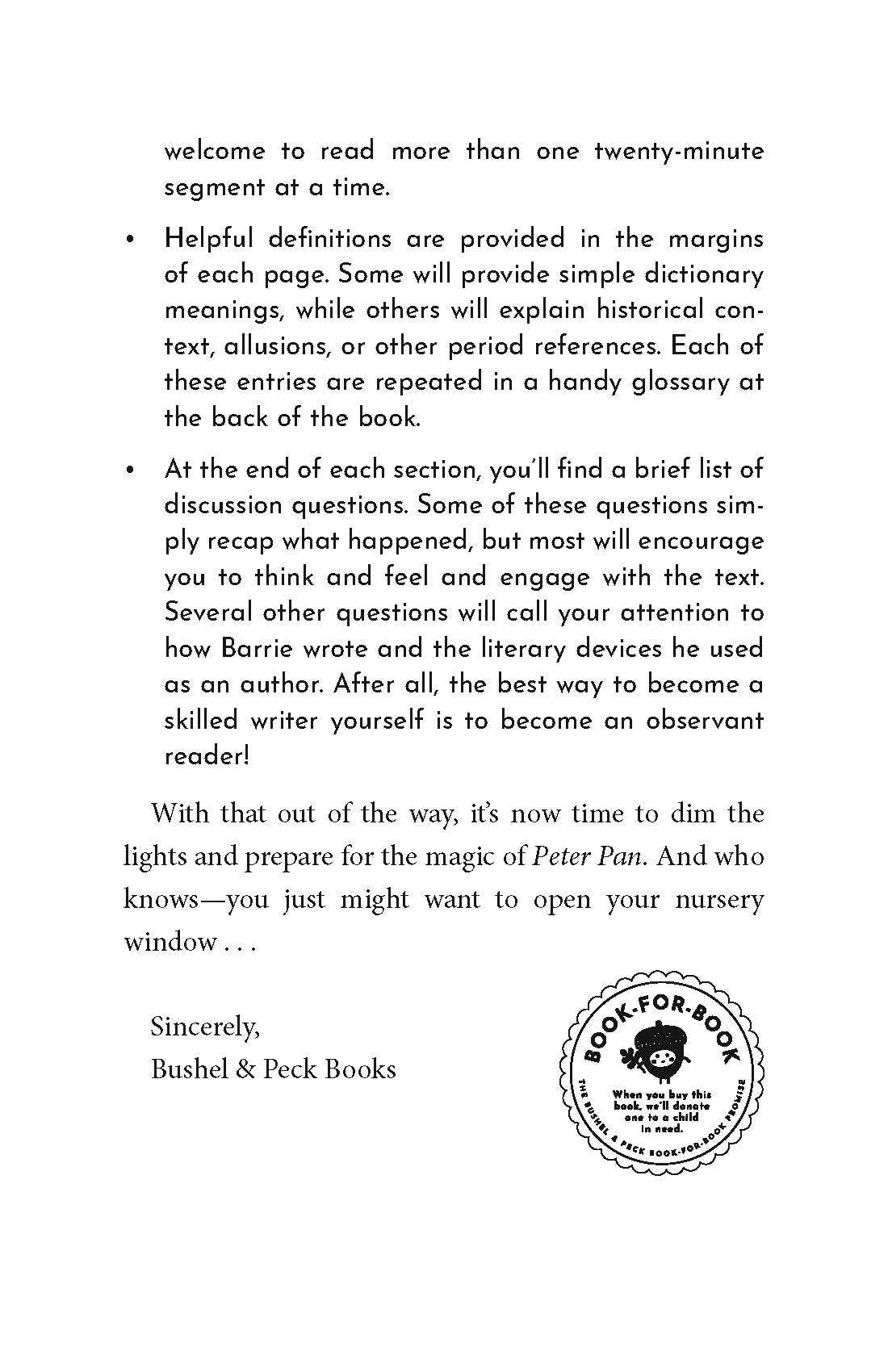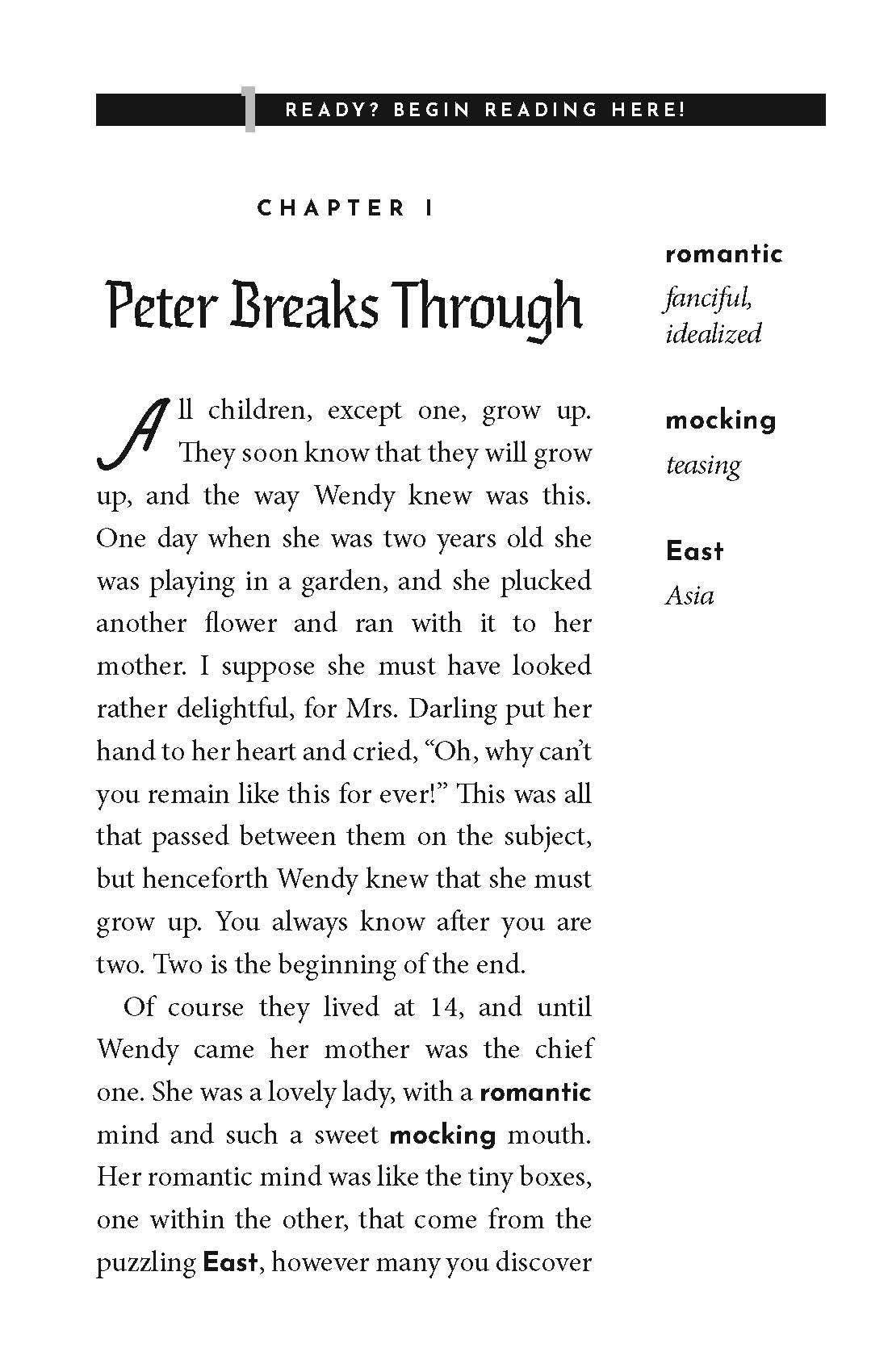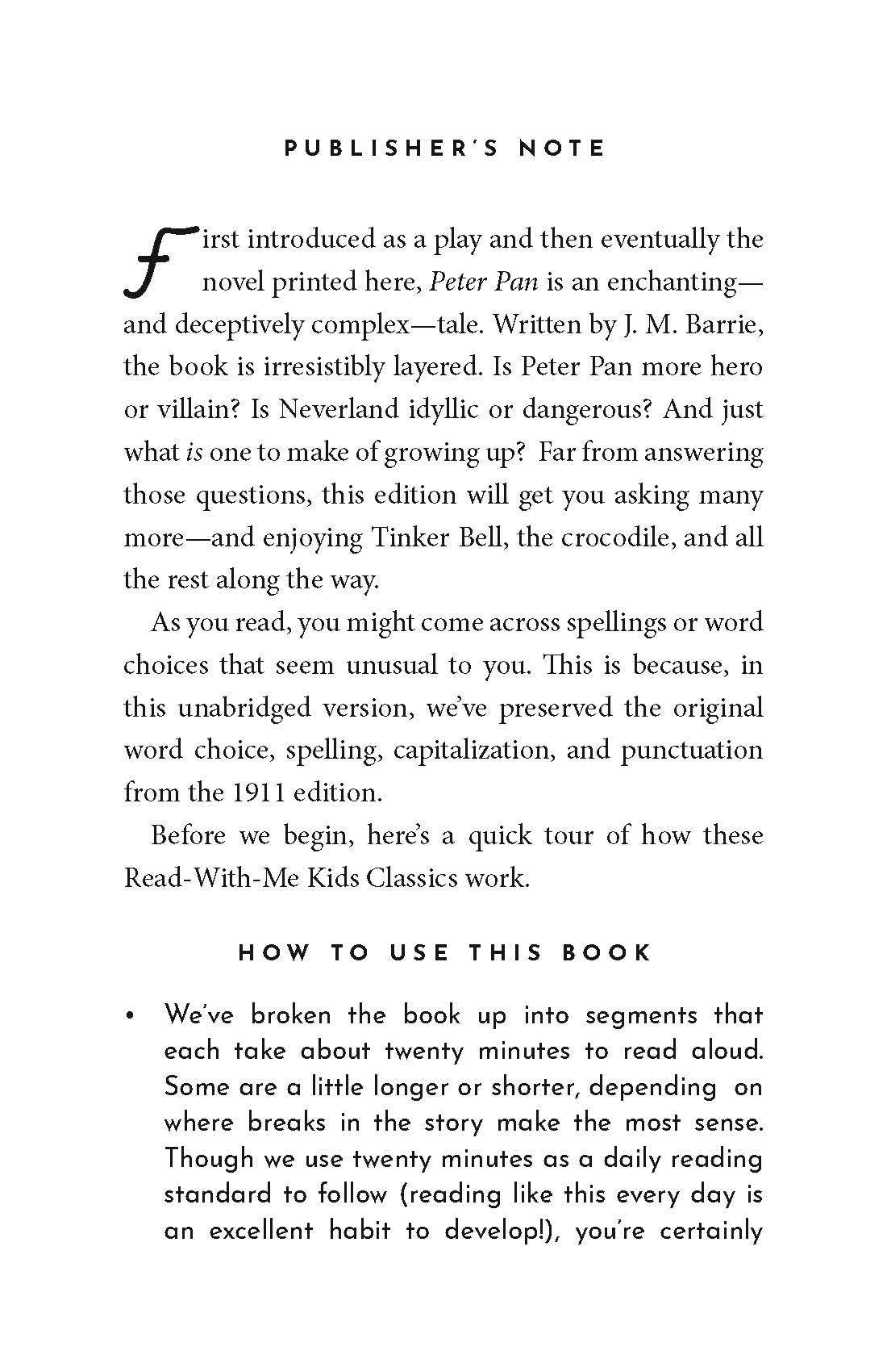 In Peter Pan: The Read-With-Me Edition, the unabridged text of the beloved story of Peter, Captain Hook, and Neverland is broken down into easy, twenty-minute chunks—perfect for daily read-alouds. Thoughtful questions after each passage boost comprehension and facilitate meaningful discussion, while definitions in the margins make it easy for parents to explain what challenging words might mean. Learn vocabulary, strengthen literacy, introduce the classics, and bond over beautiful literature in just 20 minutes a day!