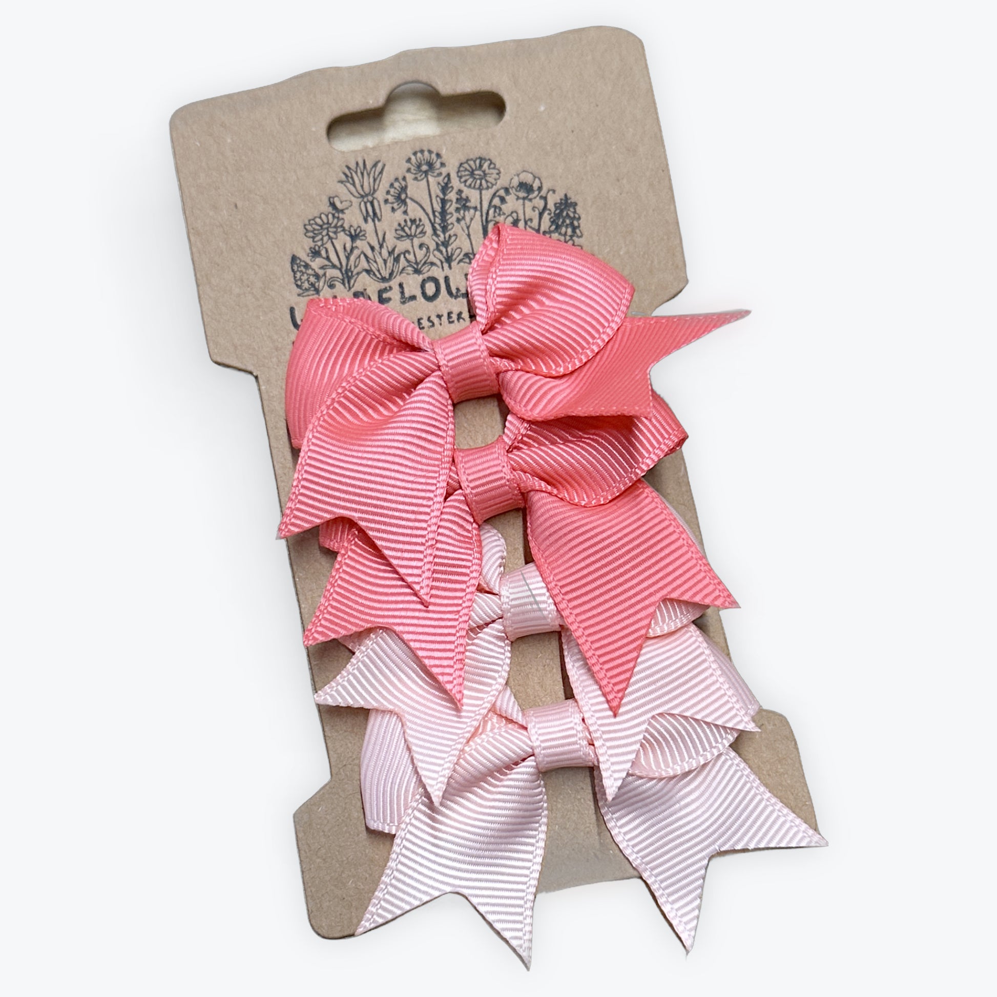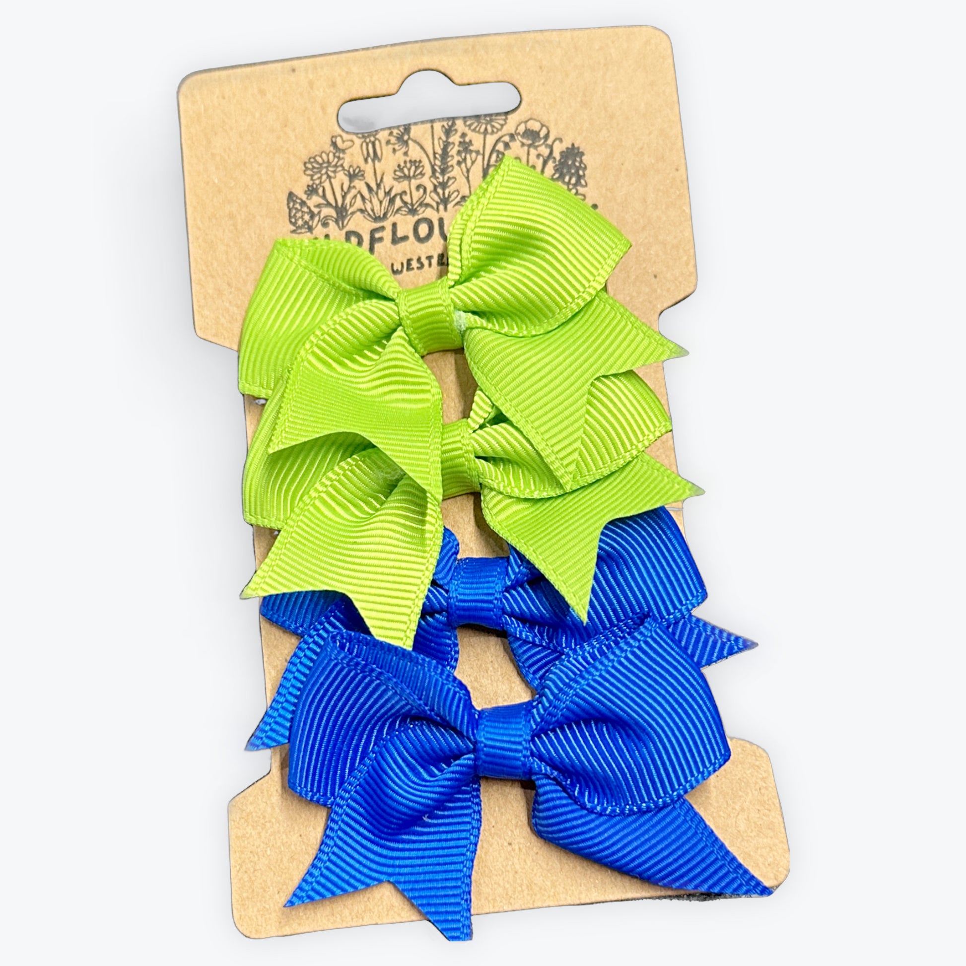 These 4 packs of bows are perfect for pigtails! Each set has two pairs of colorful grosgrain bows. At 2 inched wide they are the perfect size for babies though big girls!