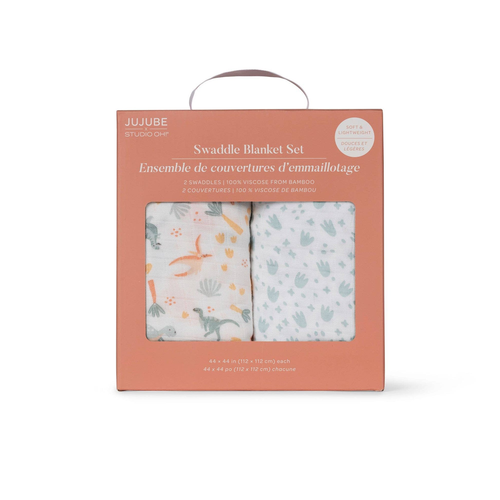 The Swaddle Blanket Set from JuJuBe × Studio Oh! includes two blankets, each with an irresistible, on-trend design. While perfect for swaddling newborns, these blankets can also be used for tummy time, as lightweight stroller covers, and as nursing throws. Each measures 44 by 44 inches (112 cm × 112 cm) and is made of sustainable, non-GMO bamboo fabric that is gentle and soft on Baby’s skin. Designed with sweet artwork in nursery-friendly colors, these blankets come packaged in a giftable box, making them a perfect surprise for new parents and moms-to-be. Two swaddle blankets measuring 44"W × 44"L (112 cm × 112 cm) each 100% viscose from bamboo; produced using non-GMO, sustainable plants Machine washable